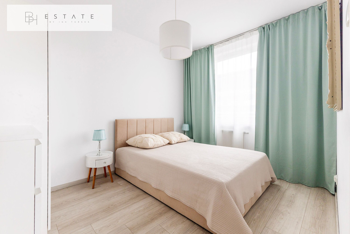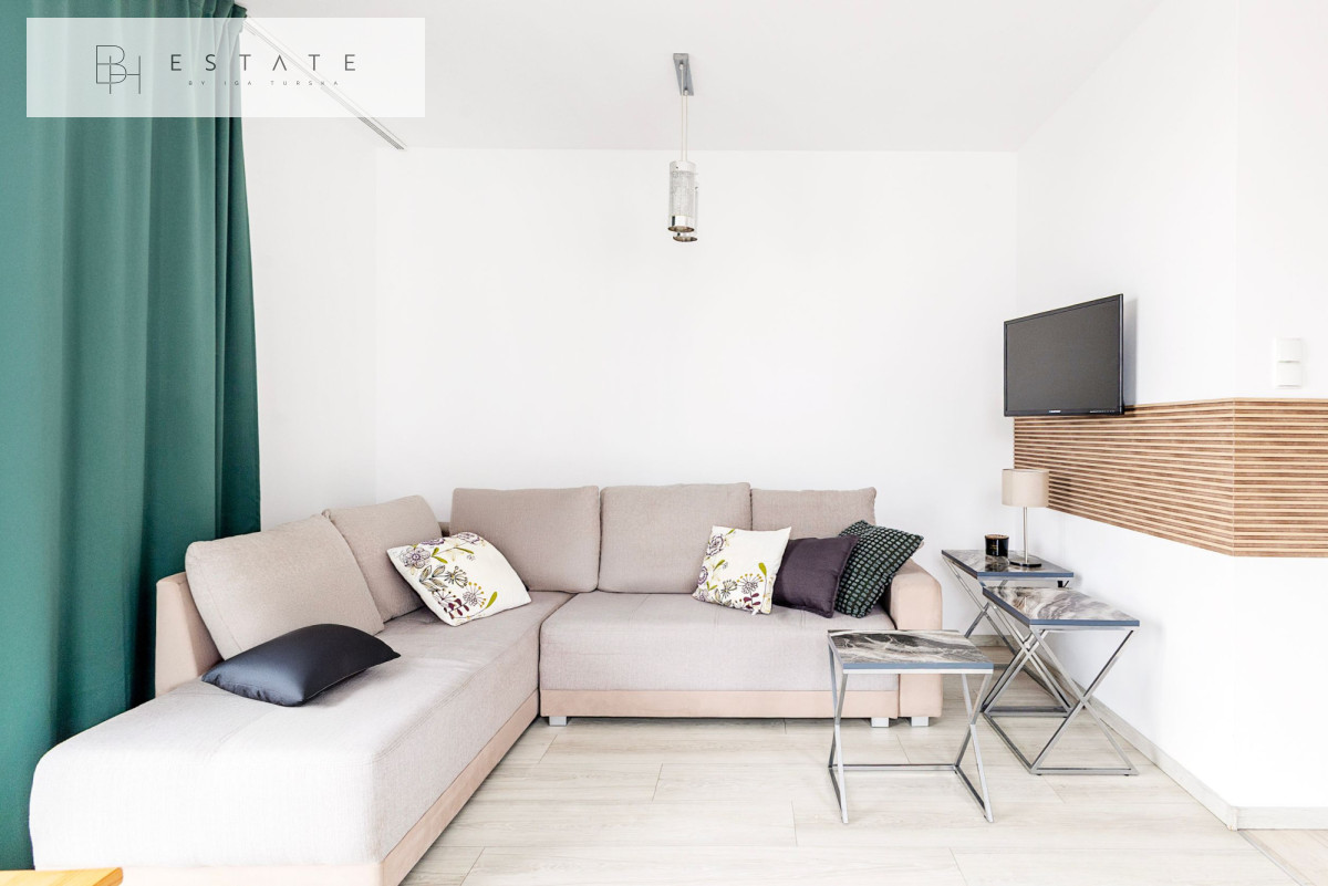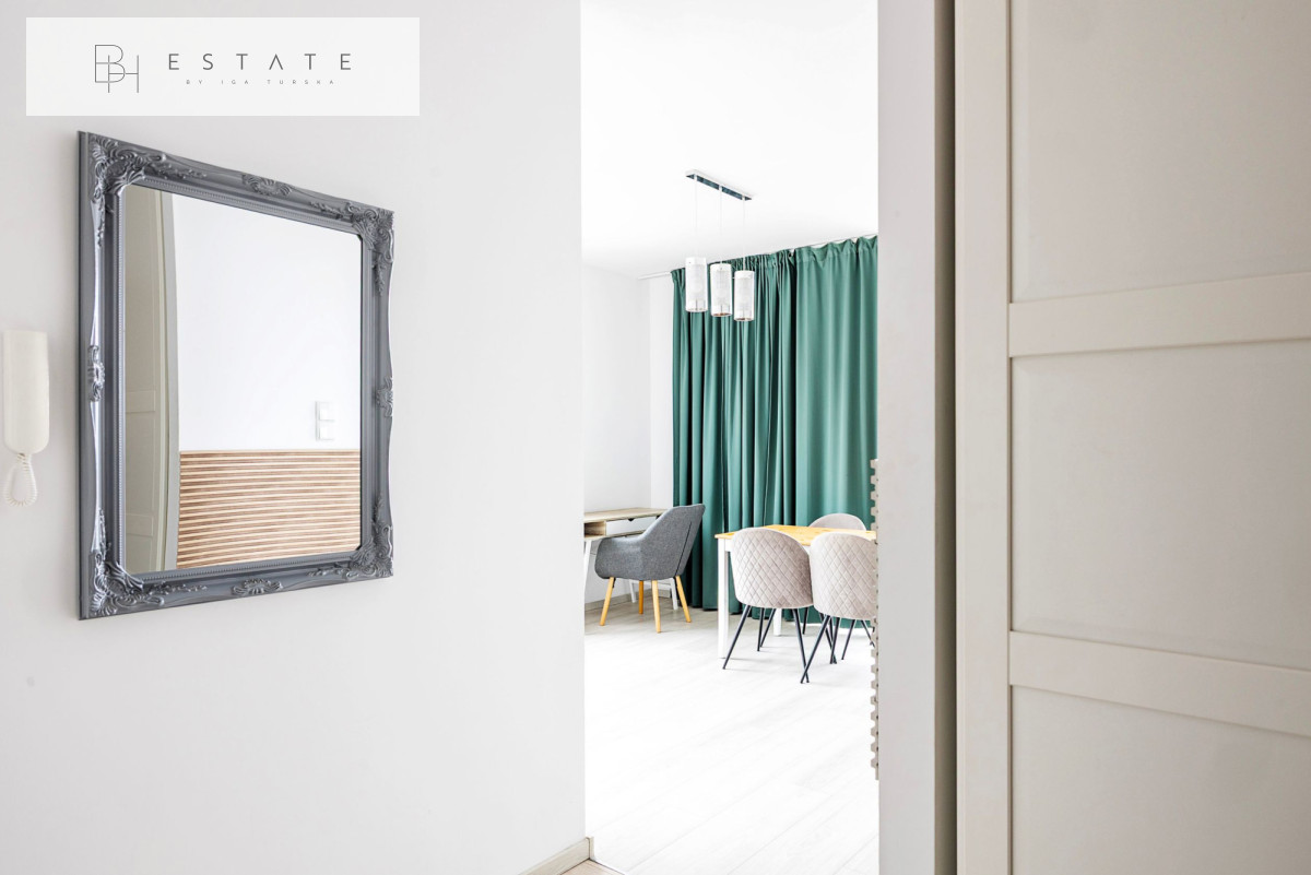 Wnętrze zostało wykończone w nowoczesnym stylu. Salon podzielono na część wypoczynkową (sofa, TV) oraz jadalnianą. Aneks kuchenny wyposażono w zabudowę meblową z wbudowanym sprzętem AGD oraz funkcjonalną wyspę. W sypialni znajduje się wygodne dwuosobowe łóżko, a w przedpokoju duża szafa w zabudowie.