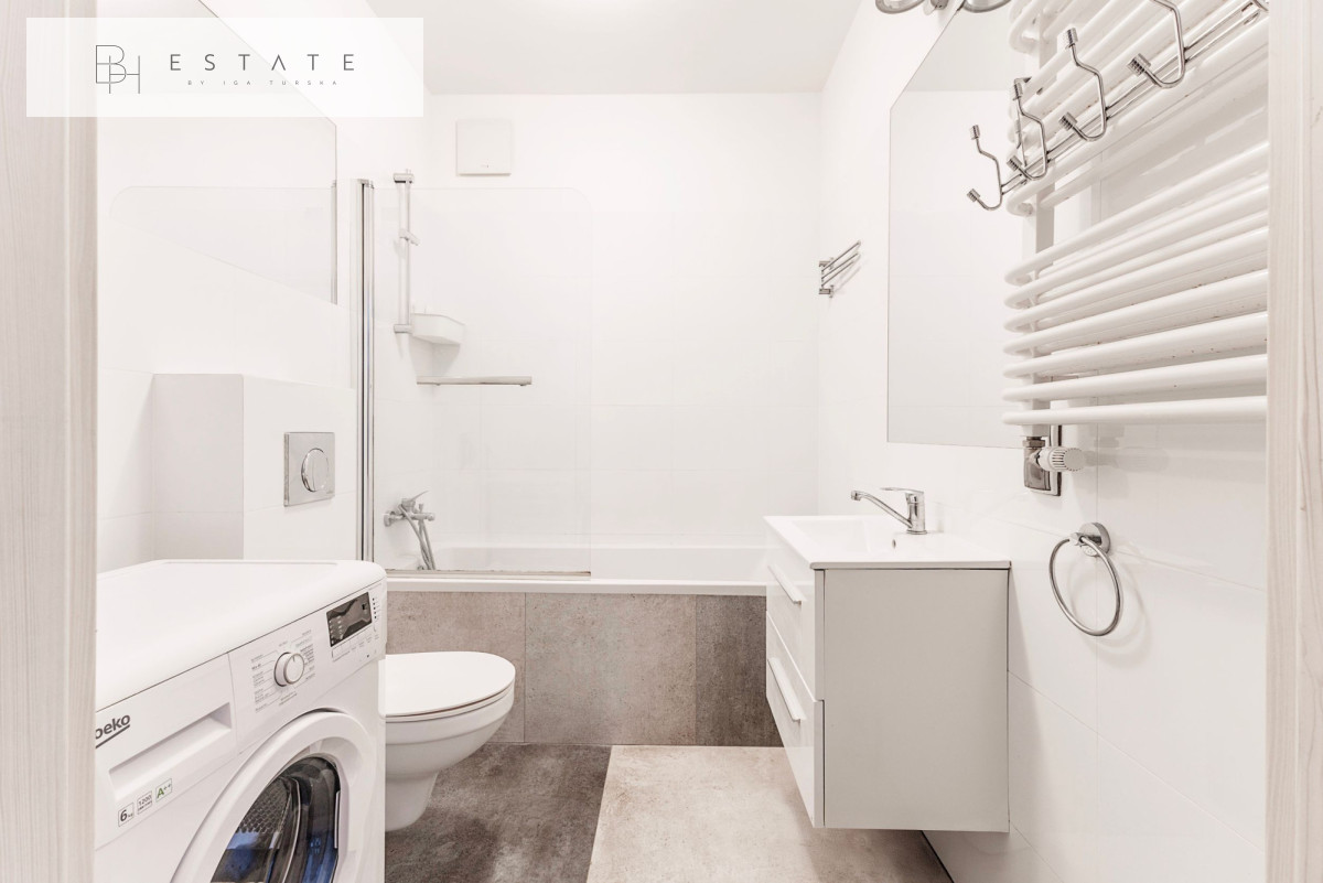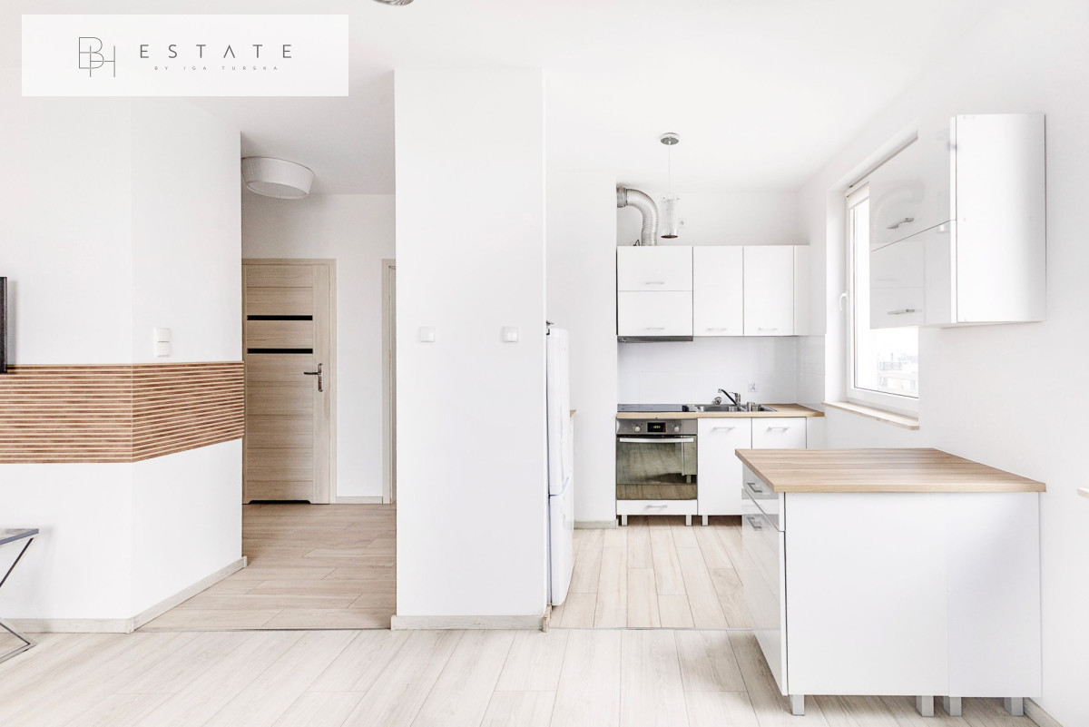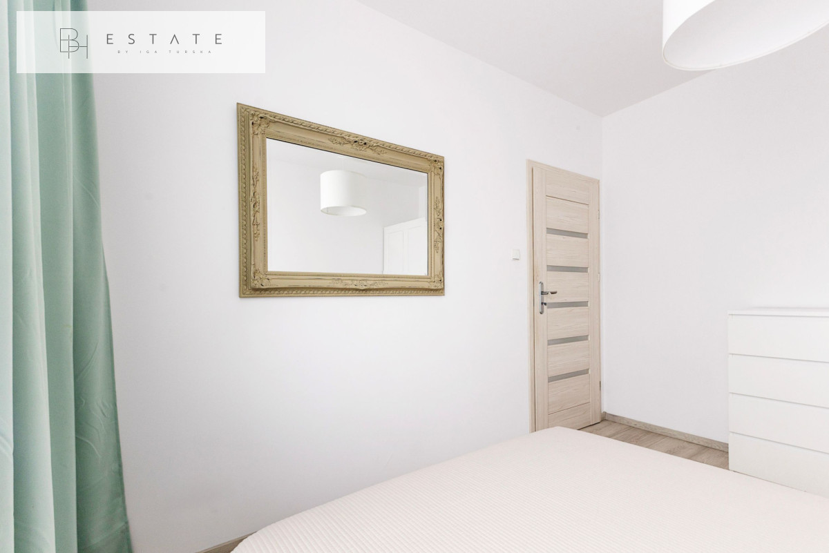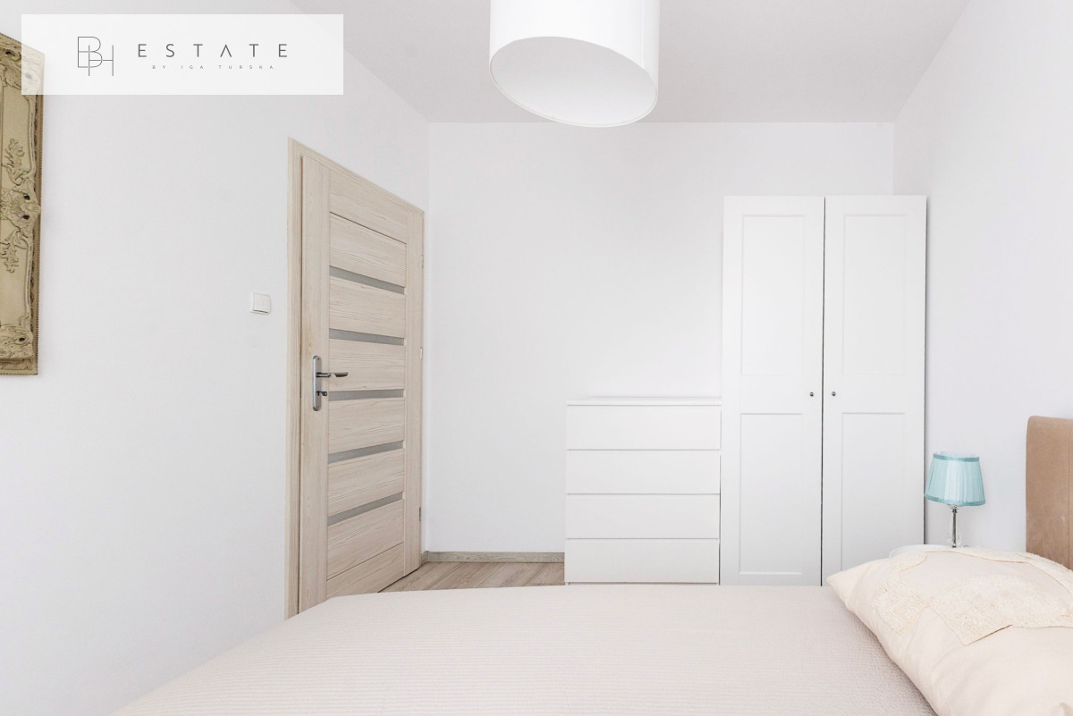 Wnętrze zostało wykończone w nowoczesnym stylu. Salon podzielono na część wypoczynkową (sofa, TV) oraz jadalnianą. Aneks kuchenny wyposażono w zabudowę meblową z wbudowanym sprzętem AGD oraz funkcjonalną wyspę. W sypialni znajduje się wygodne dwuosobowe łóżko, a w przedpokoju duża szafa w zabudowie.