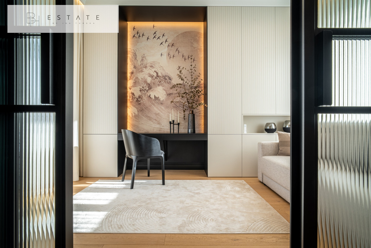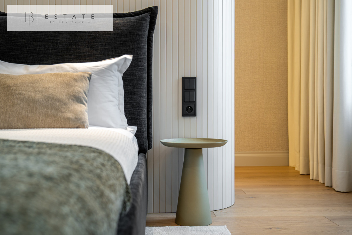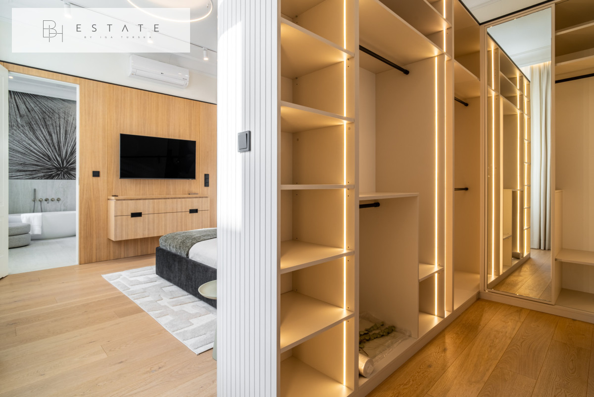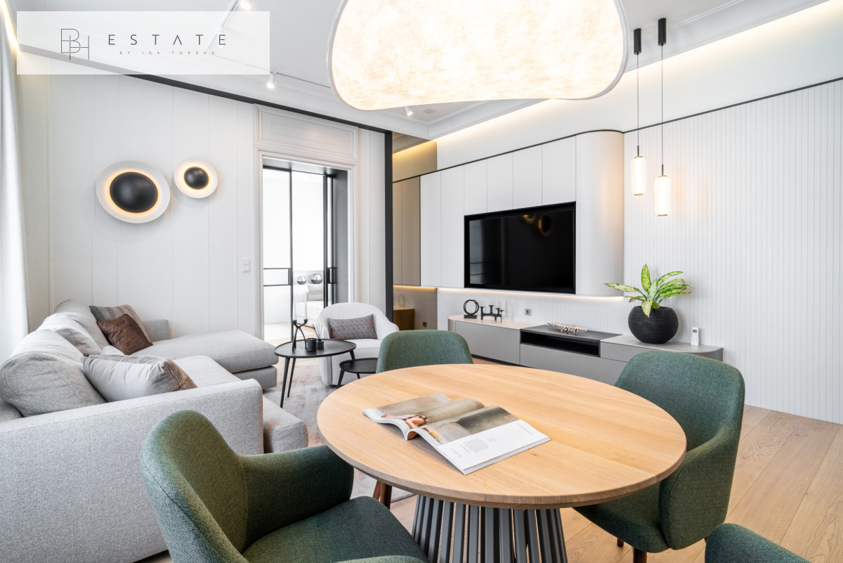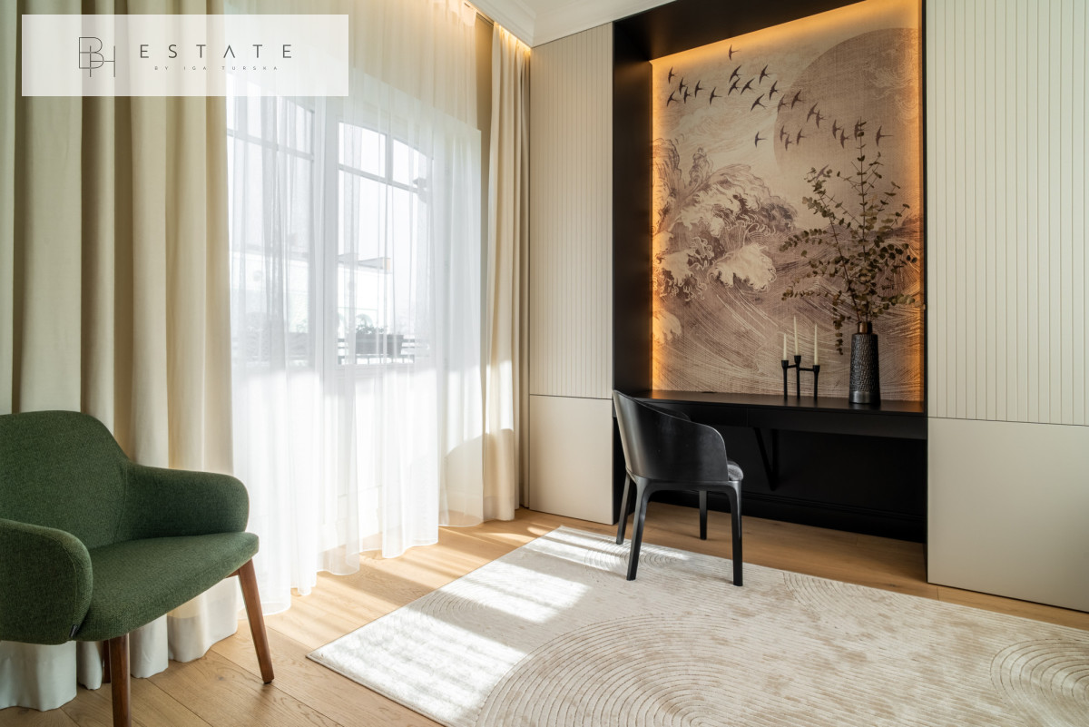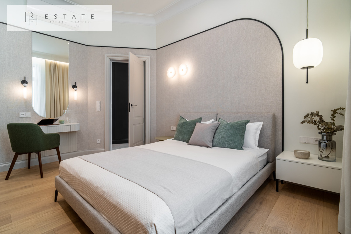 Apartament został zaprojektowany i wykończony z dbałością o każdy detal. Przemyślany układ pomieszczeń tworzy niezwykle komfortową przestrzeń mieszkalną. Wykorzystanie naturalnych materiałów, zabudów stolarskich, jak również eleganckich włoskich tapet i drewnianych podłóg podkreśla wyjątkowy charakter i ponadczasowość.