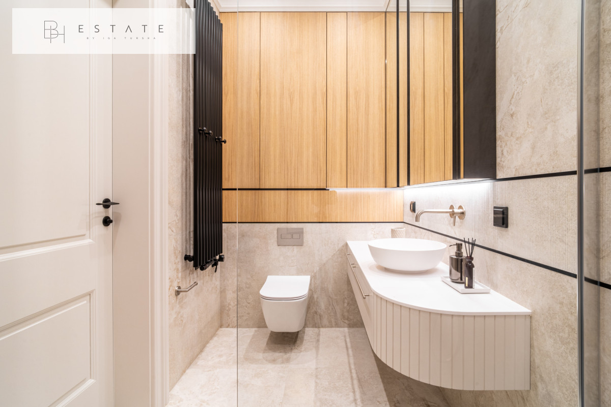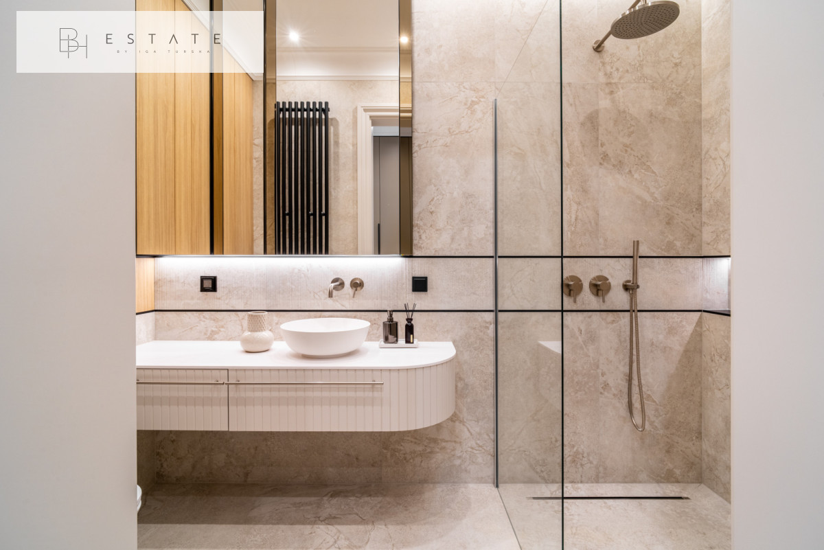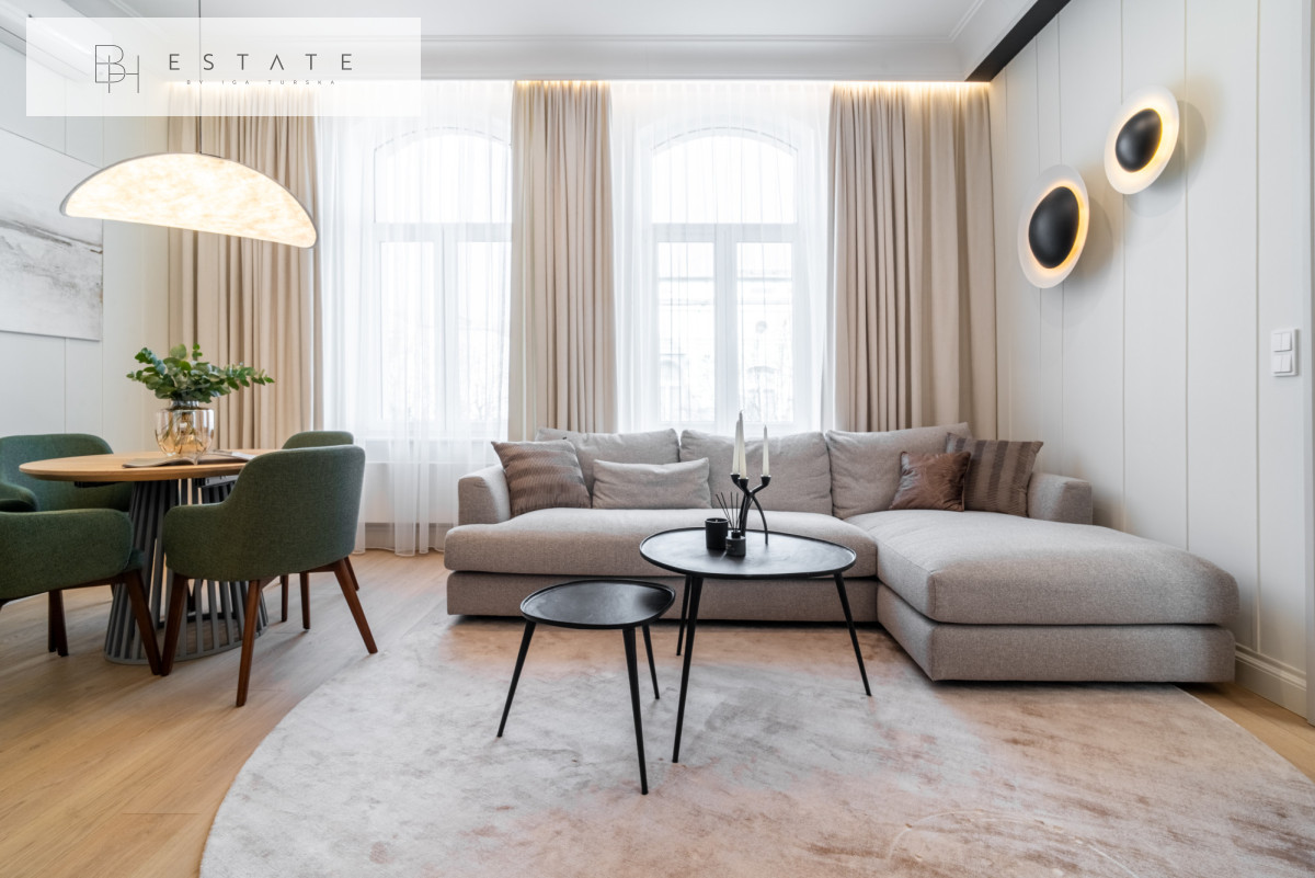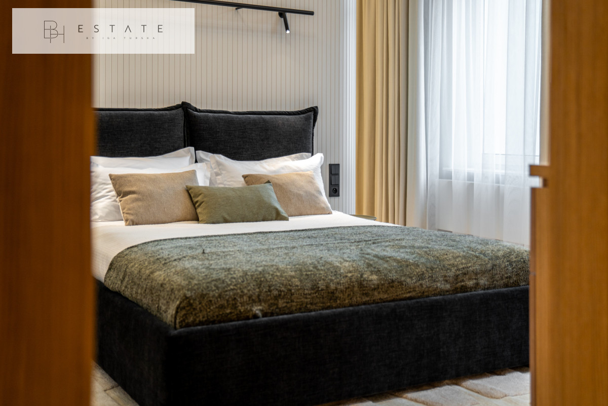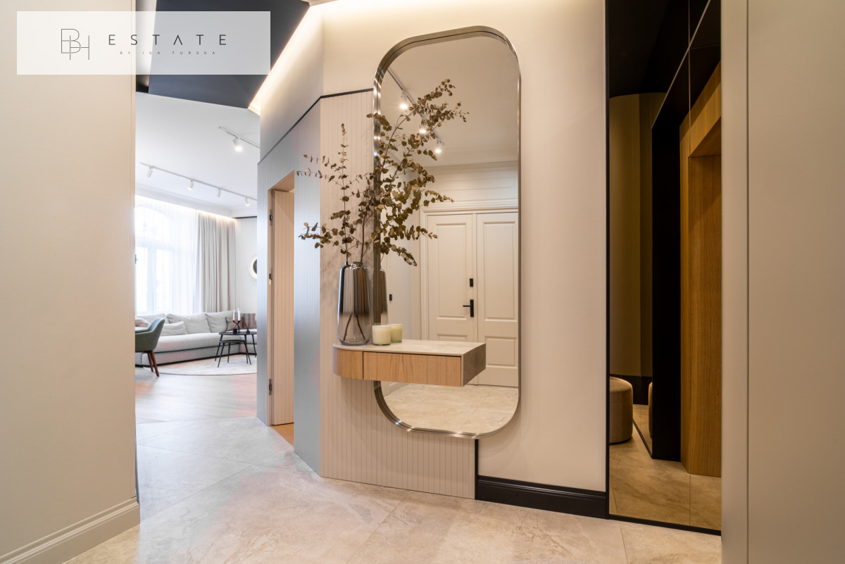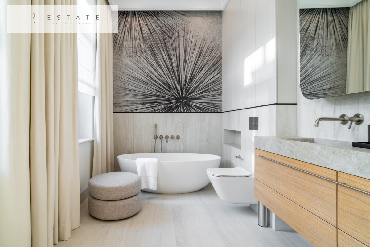 Apartament został zaprojektowany i wykończony z dbałością o każdy detal. Przemyślany układ pomieszczeń tworzy niezwykle komfortową przestrzeń mieszkalną. Wykorzystanie naturalnych materiałów, zabudów stolarskich, jak również eleganckich włoskich tapet i drewnianych podłóg podkreśla wyjątkowy charakter i ponadczasowość.