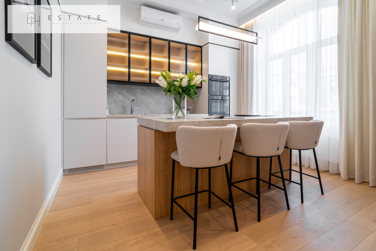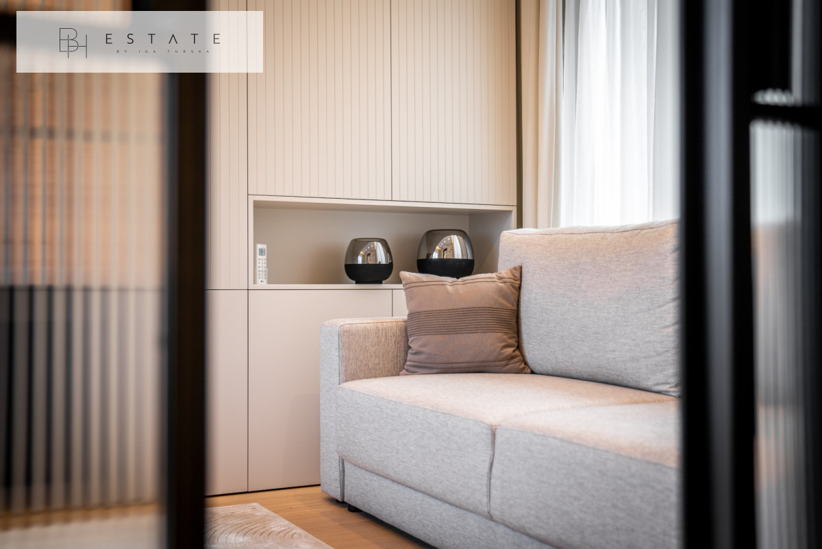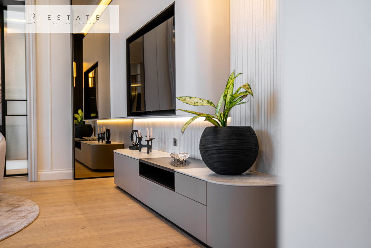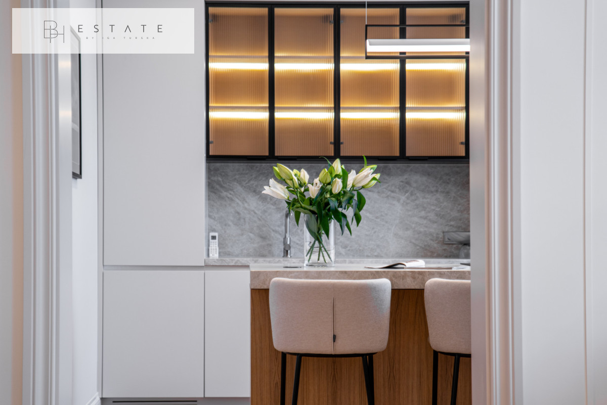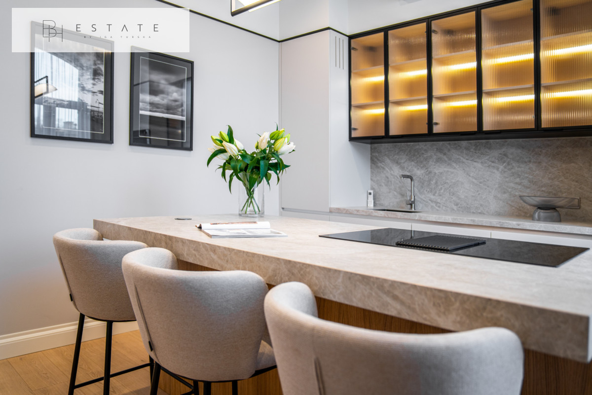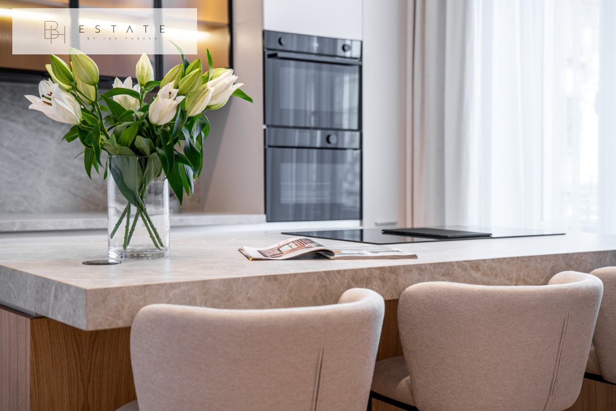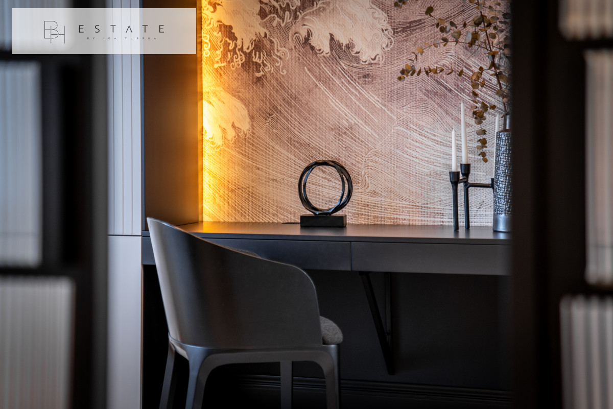 Apartament został zaprojektowany i wykończony z dbałością o każdy detal. Przemyślany układ pomieszczeń tworzy niezwykle komfortową przestrzeń mieszkalną. Wykorzystanie naturalnych materiałów, zabudów stolarskich, jak również eleganckich włoskich tapet i drewnianych podłóg podkreśla wyjątkowy charakter i ponadczasowość.