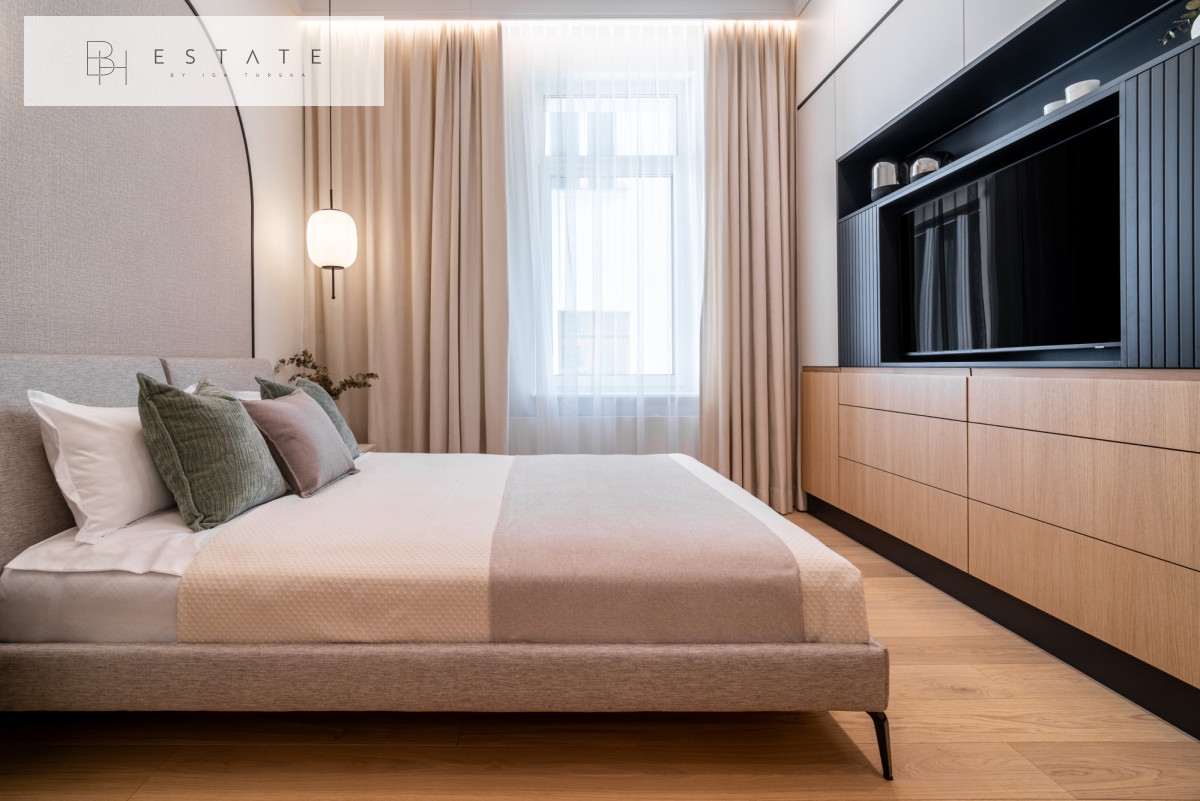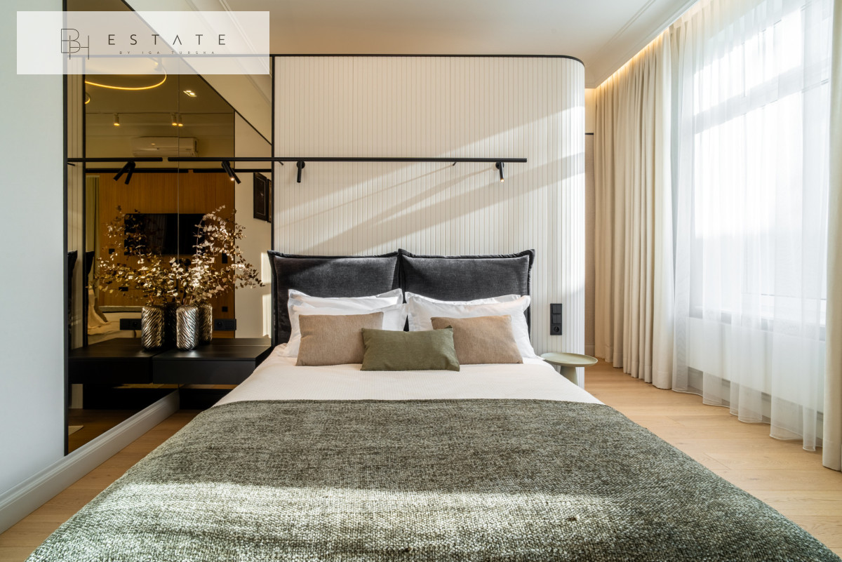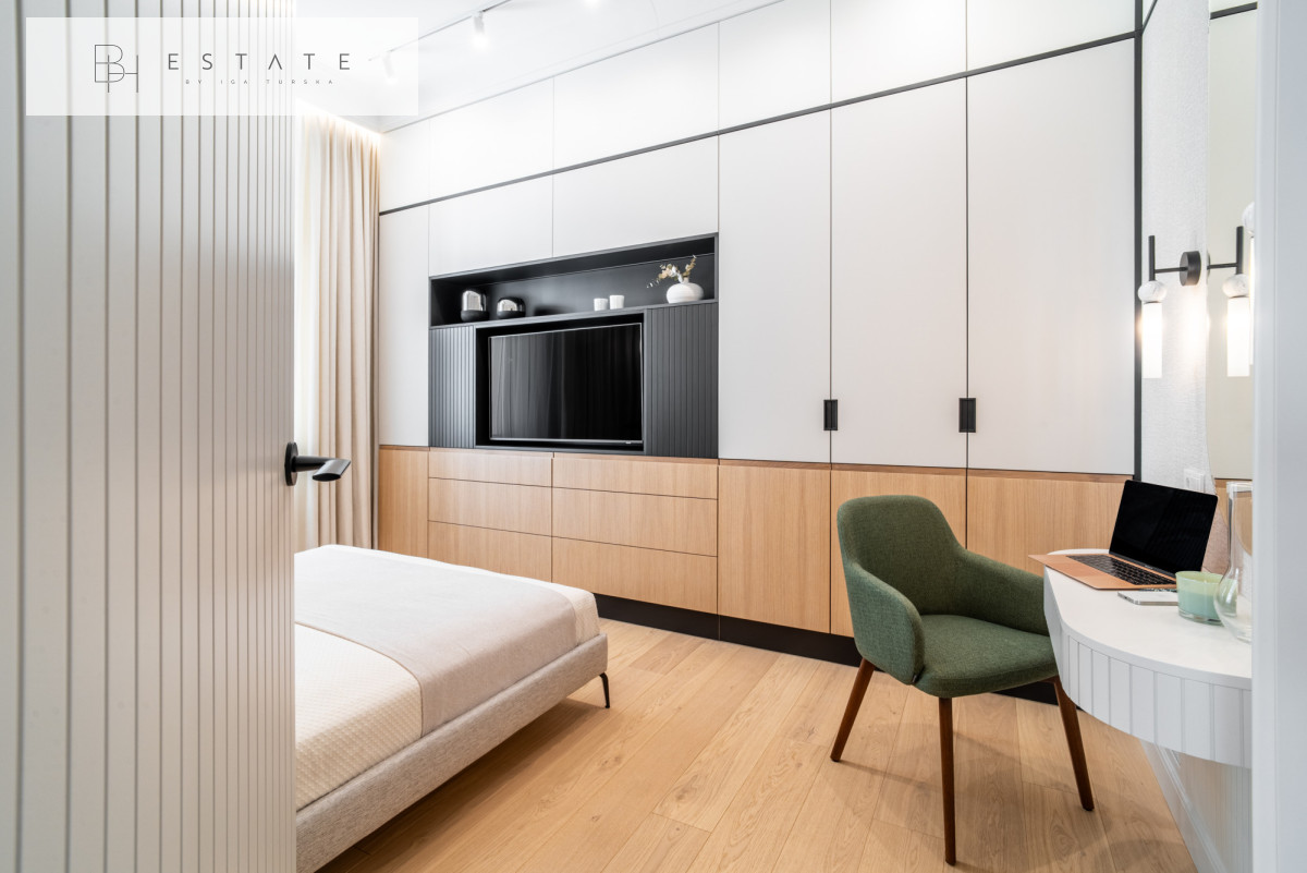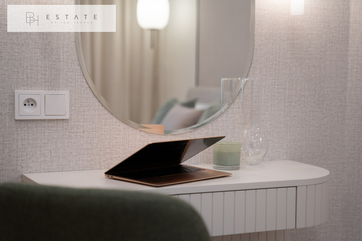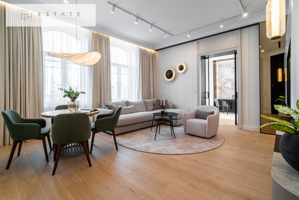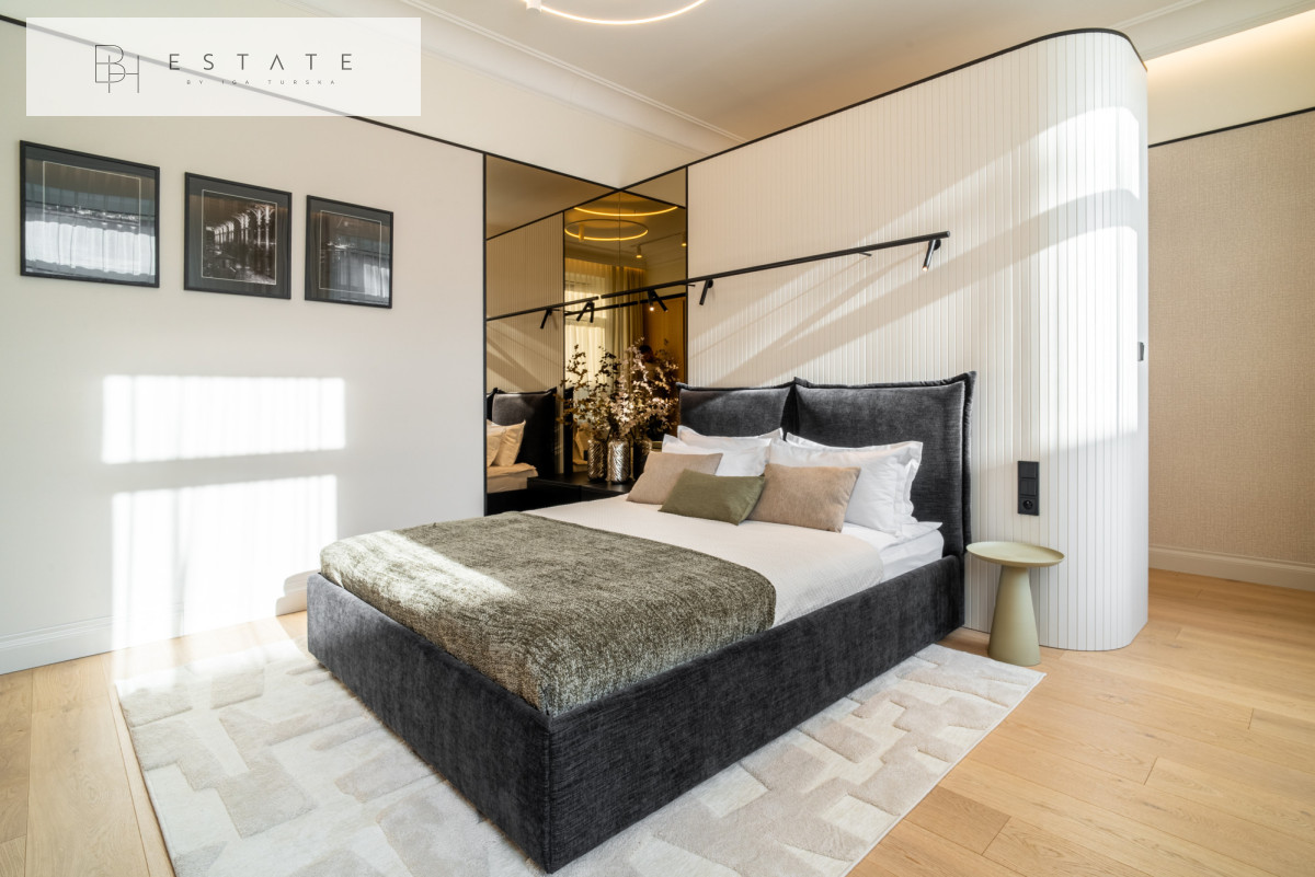 Apartament został zaprojektowany i wykończony z dbałością o każdy detal. Przemyślany układ pomieszczeń tworzy niezwykle komfortową przestrzeń mieszkalną. Wykorzystanie naturalnych materiałów, zabudów stolarskich, jak również eleganckich włoskich tapet i drewnianych podłóg podkreśla wyjątkowy charakter i ponadczasowość.