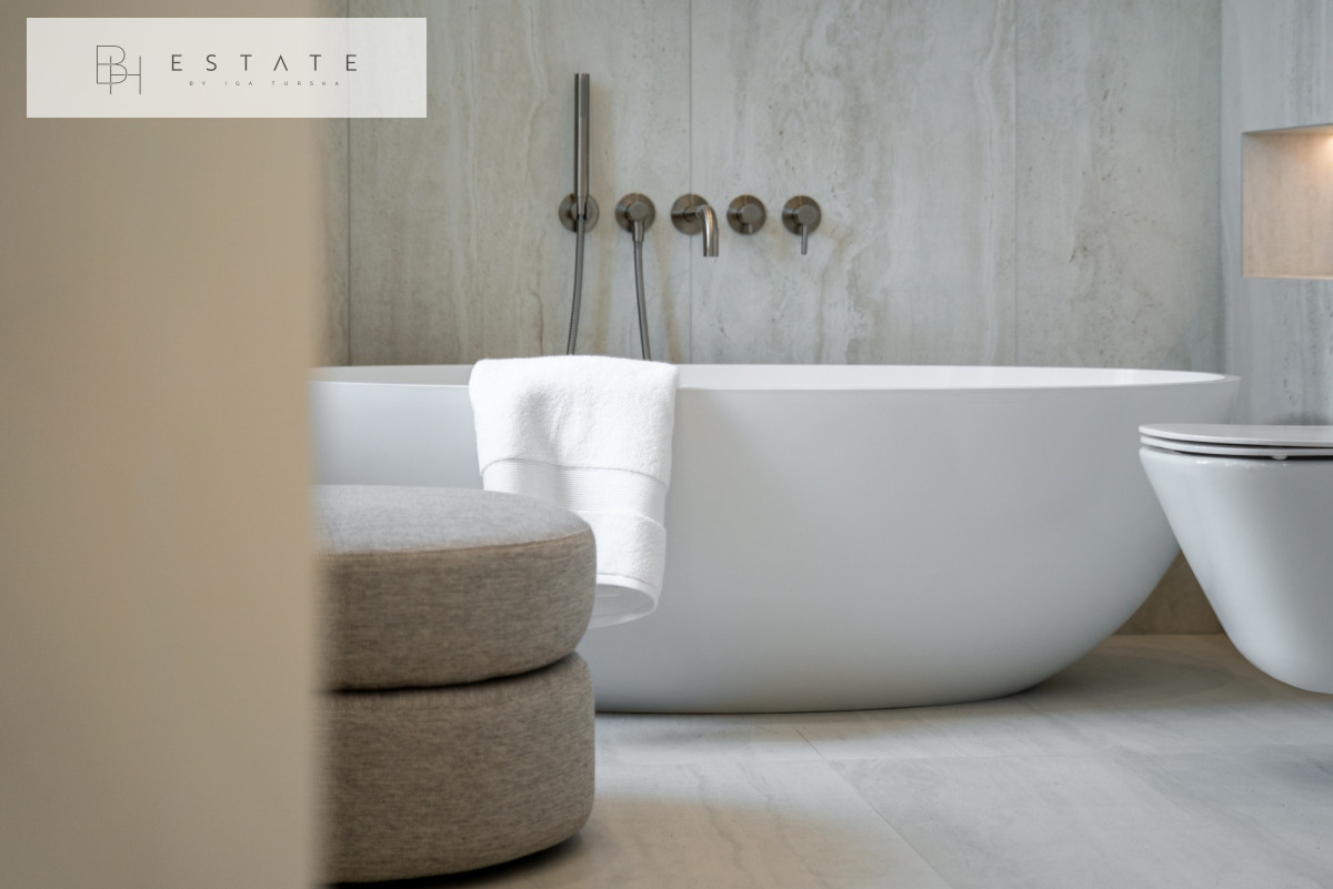 Część prywatna apartamentu to sypialnia master bedroom z dużym łożem, za którym powstała wydzielona zabudową meblową garderoba. Z sypialni przejście do łazienki, która dzięki swojej powierzchni, jak i wolnostojącej wannie tworzy pokój kąpielowy, który spełni potrzeby domowego spa.