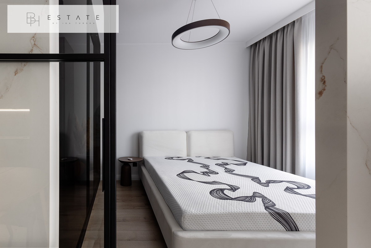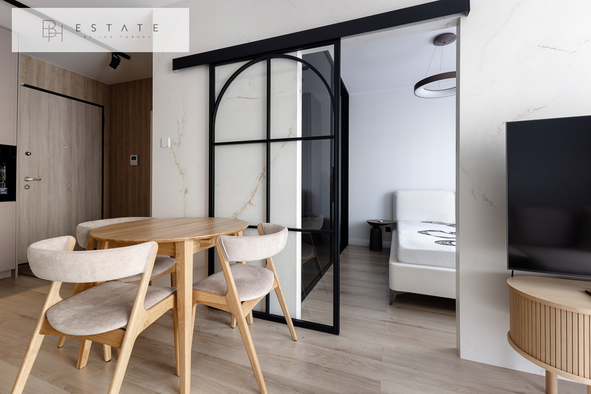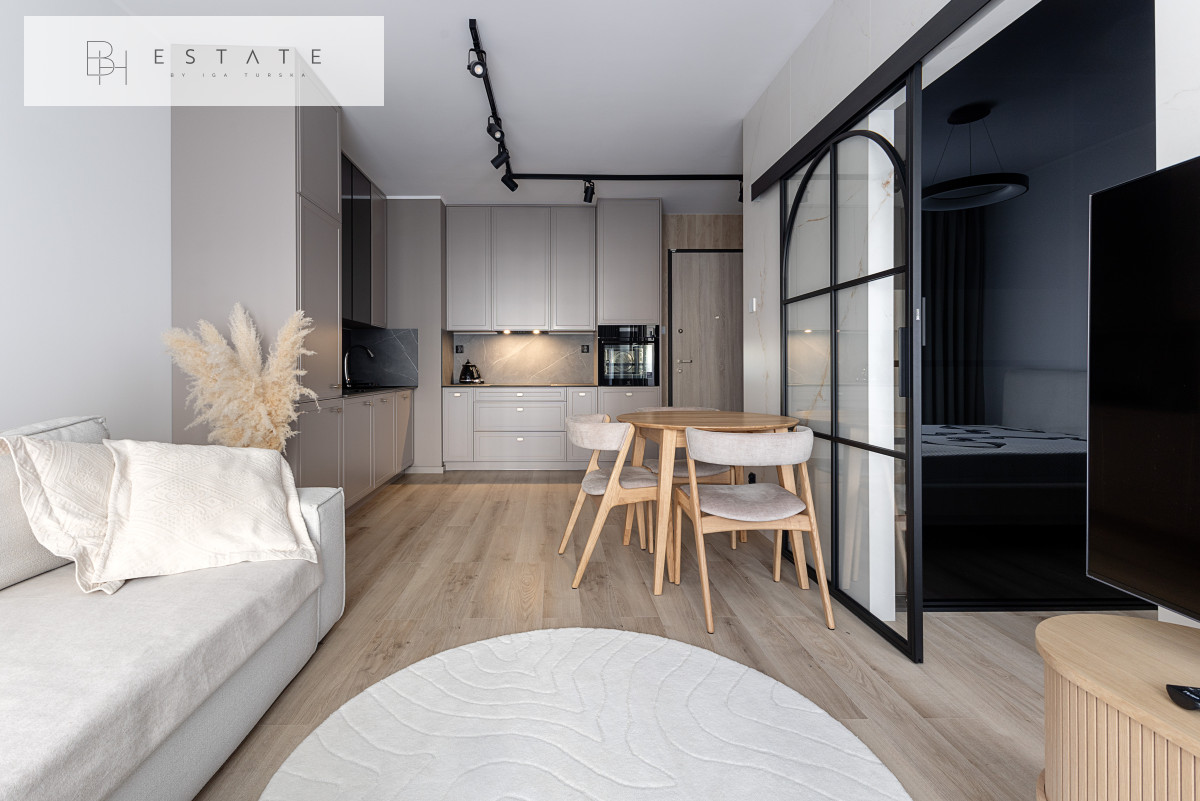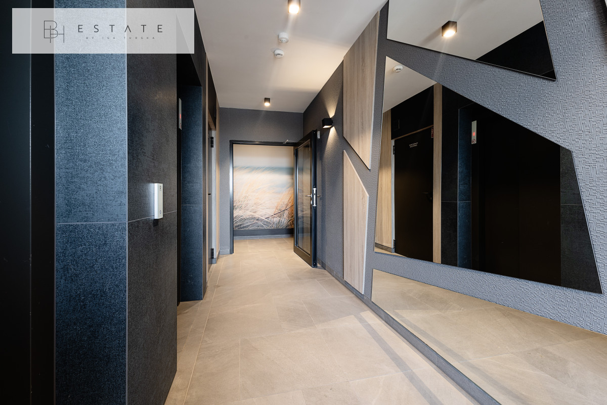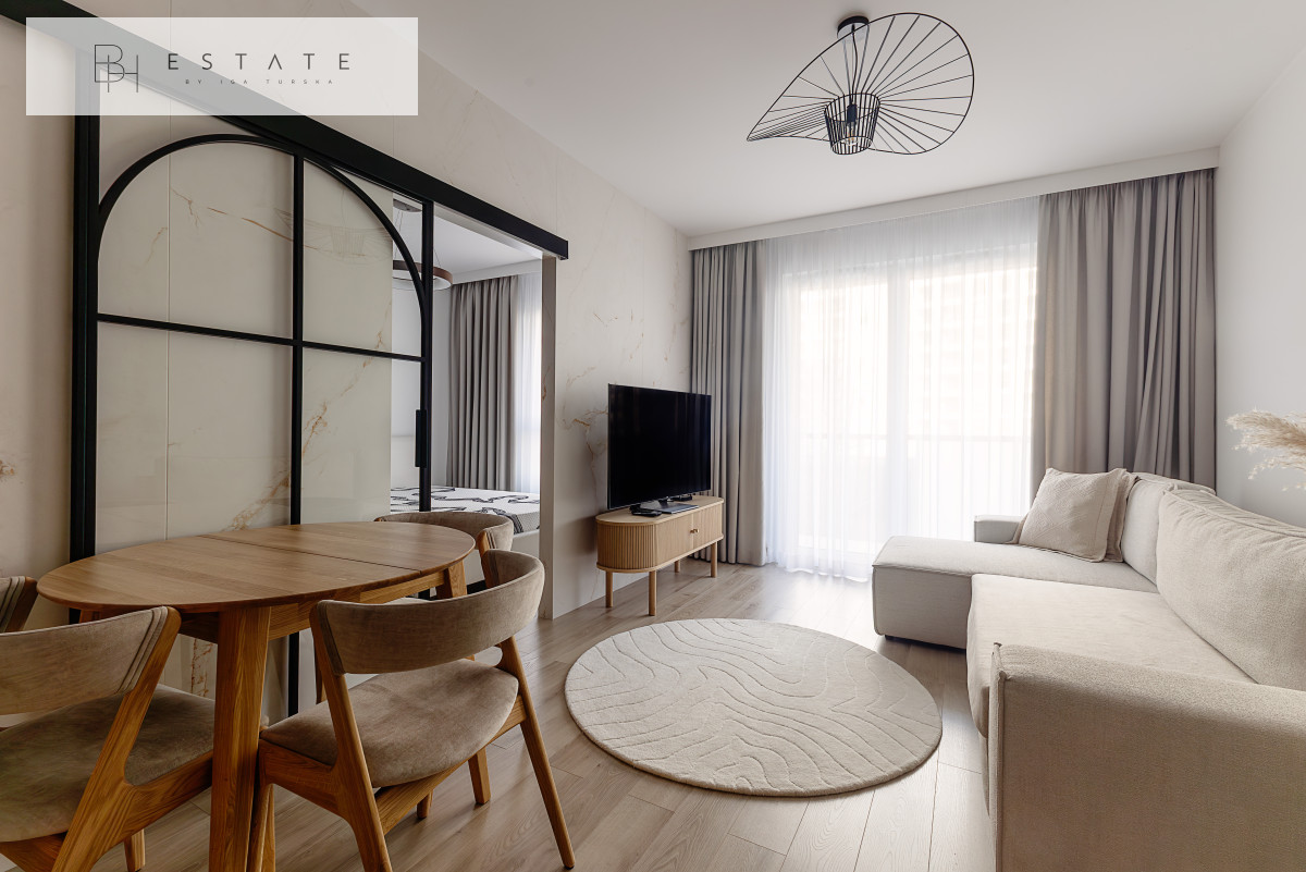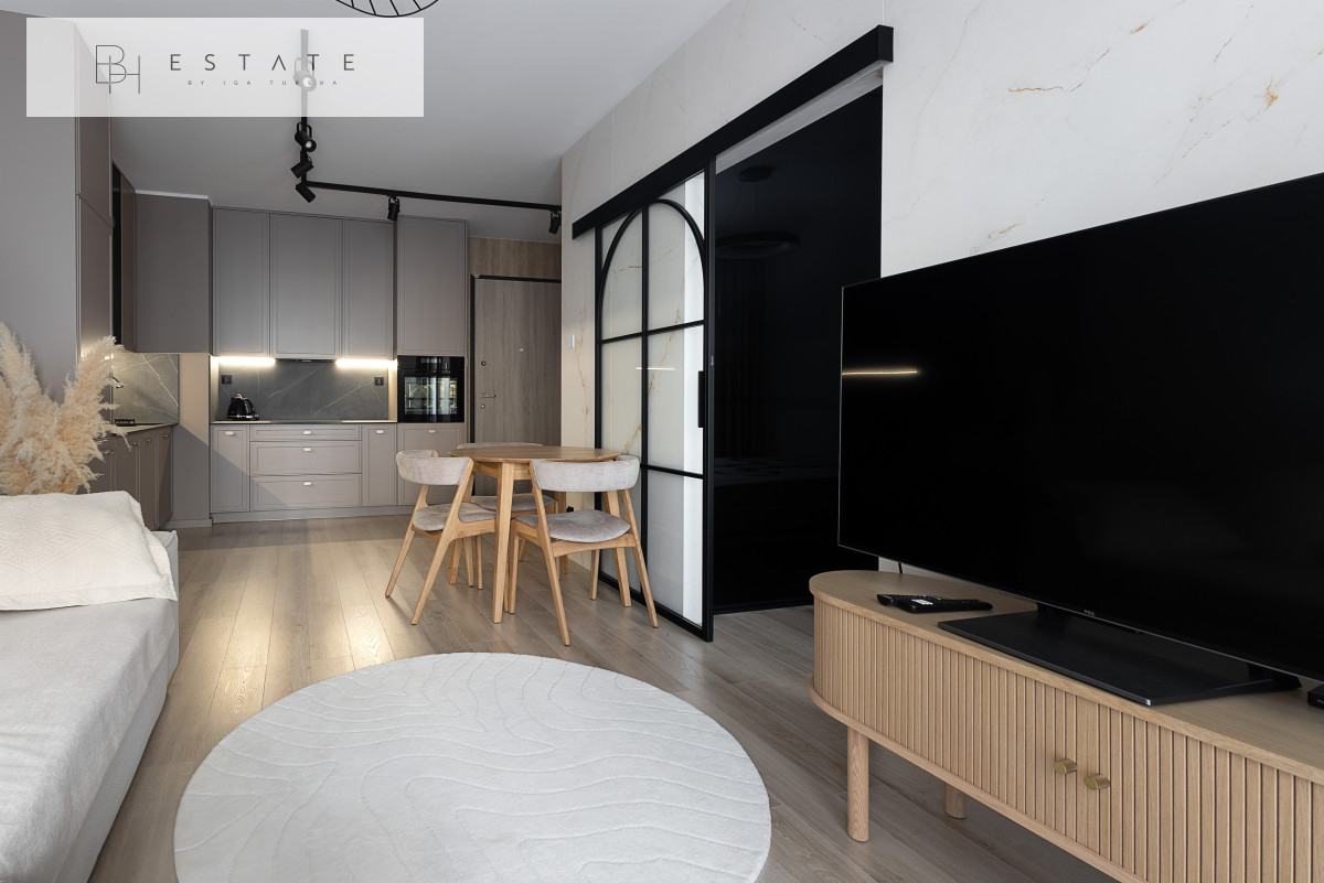 Przestronny słoneczny apartament usytuowany na 2 piętrze. Mieszkanie nigdy nie było wynajmowane. Wnętrze zostało wykonane bardzo starannie, przy wykorzystaniu materiałów i sprzętów wysokiej klasy. Aneks kuchenny jest wyposażony w zabudowę meblową wykonaną przez stolarza na zamówienie oraz w sprzęt AGD (płyta indukcyjna, lodówko-zamrażarka, piekarnik, okap, zmywarka). Salon z aneksem został połączony stołem z krzesłami. Na wyposażenie salonu składa się sofa z funkcją spania oraz komoda RTV z zupełnie nowym TV marki Samsung. Sypialnia została oddzielona szklanymi przesuwnymi drzwiami. Łazienka jest bardzo przestronna z licznym miejscem do przechowywania oraz kabiną prysznicową sporych rozmiarów.