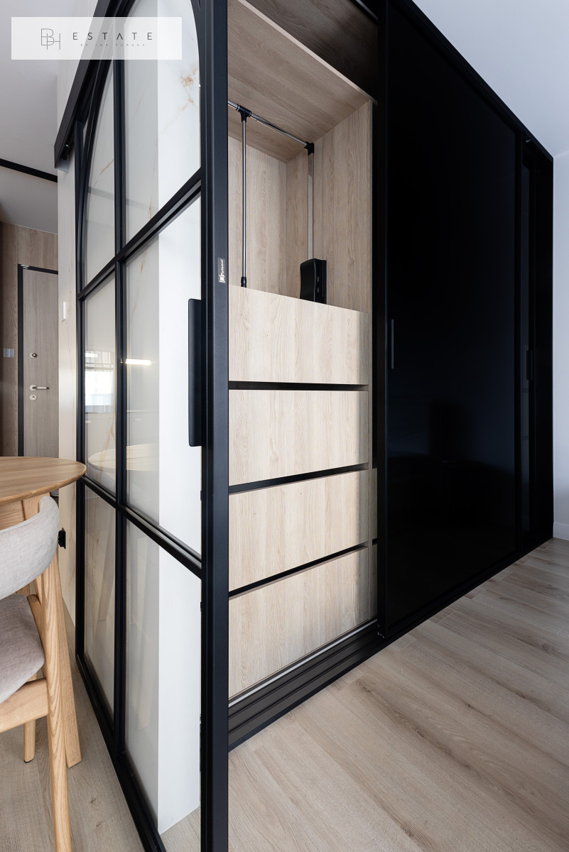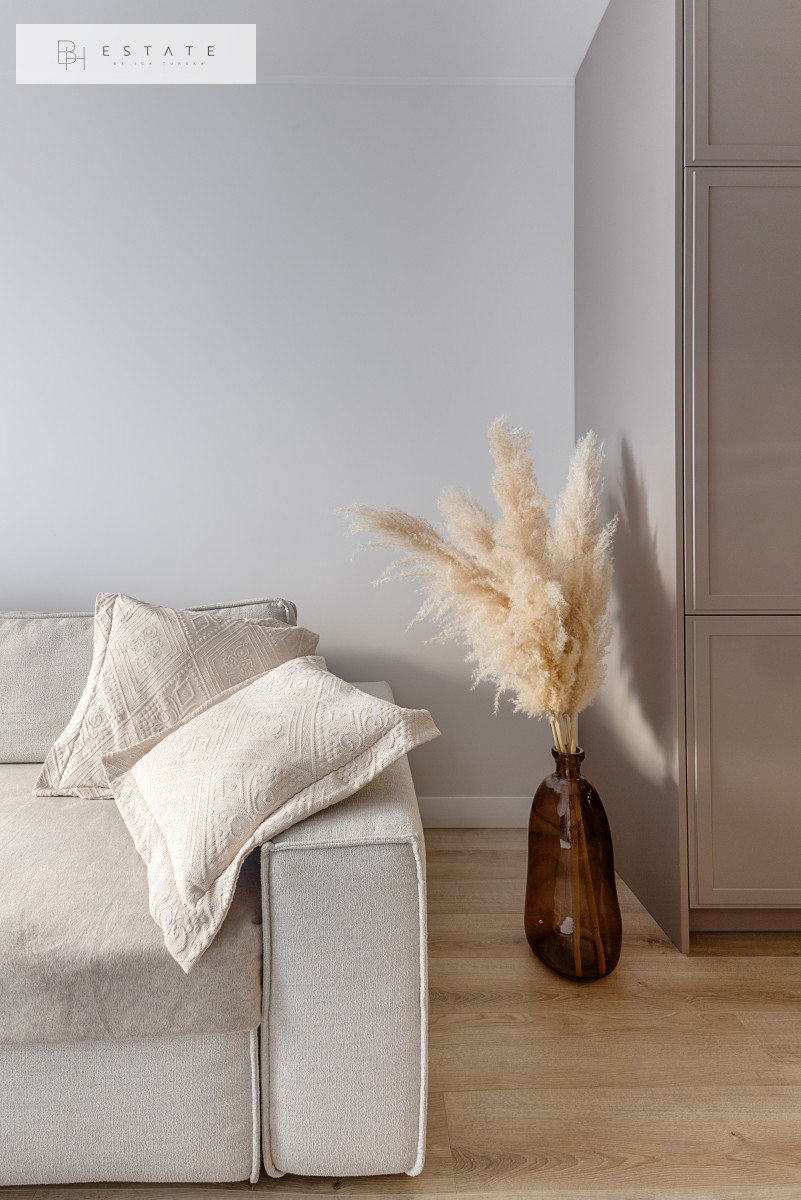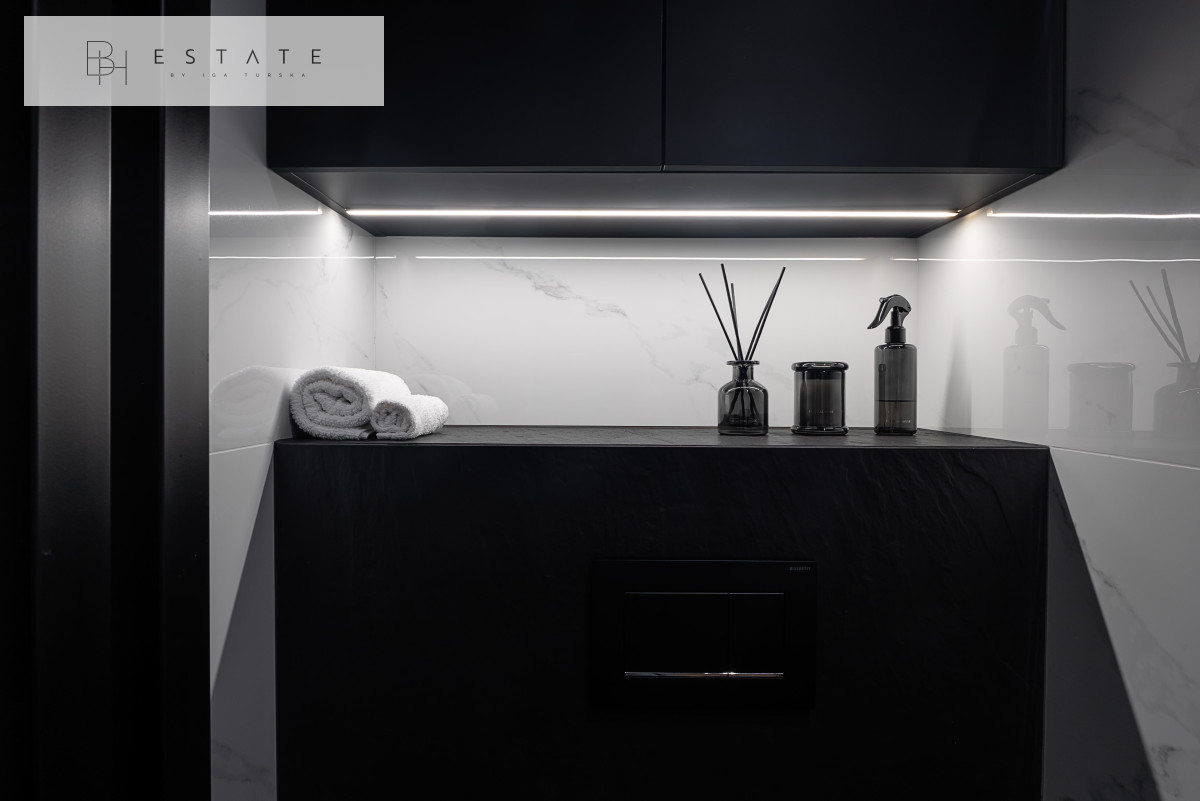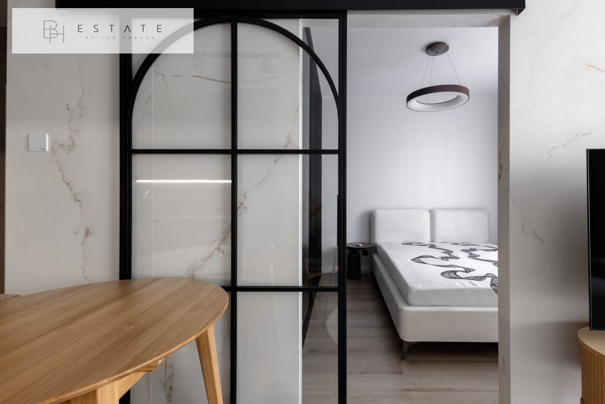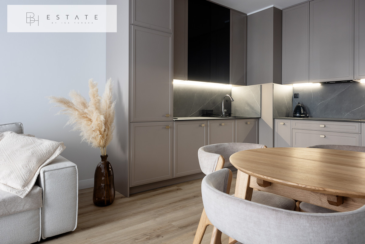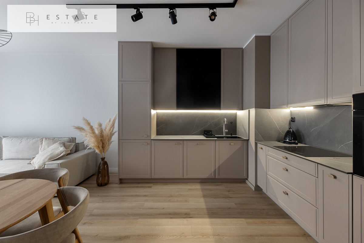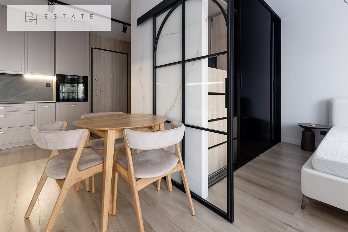 Przestronny słoneczny apartament usytuowany na 2 piętrze. Mieszkanie nigdy nie było wynajmowane. Wnętrze zostało wykonane bardzo starannie, przy wykorzystaniu materiałów i sprzętów wysokiej klasy. Aneks kuchenny jest wyposażony w zabudowę meblową wykonaną przez stolarza na zamówienie oraz w sprzęt AGD (płyta indukcyjna, lodówko-zamrażarka, piekarnik, okap, zmywarka). Salon z aneksem został połączony stołem z krzesłami. Na wyposażenie salonu składa się sofa z funkcją spania oraz komoda RTV z zupełnie nowym TV marki Samsung. Sypialnia została oddzielona szklanymi przesuwnymi drzwiami. Łazienka jest bardzo przestronna z licznym miejscem do przechowywania oraz kabiną prysznicową sporych rozmiarów.
